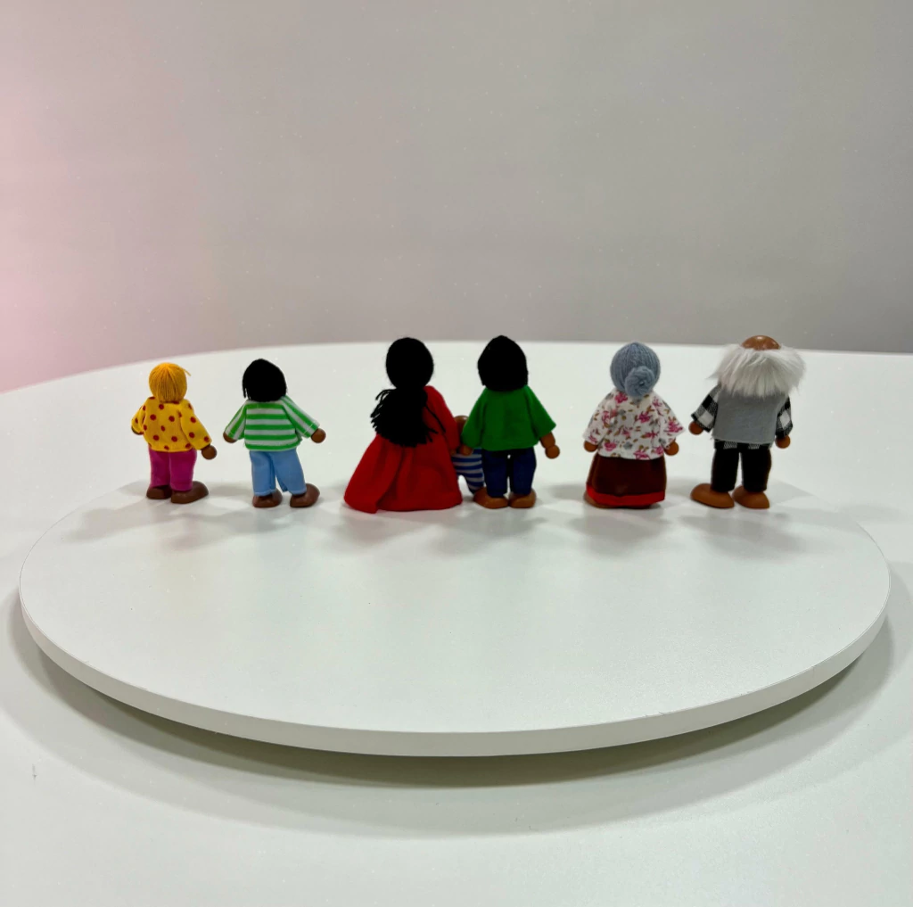 07 bonecos articulados e personalizados em madeira: 1 casal de avós + 1 casal de adultos + 1 casal de crianças + 1 bebê.