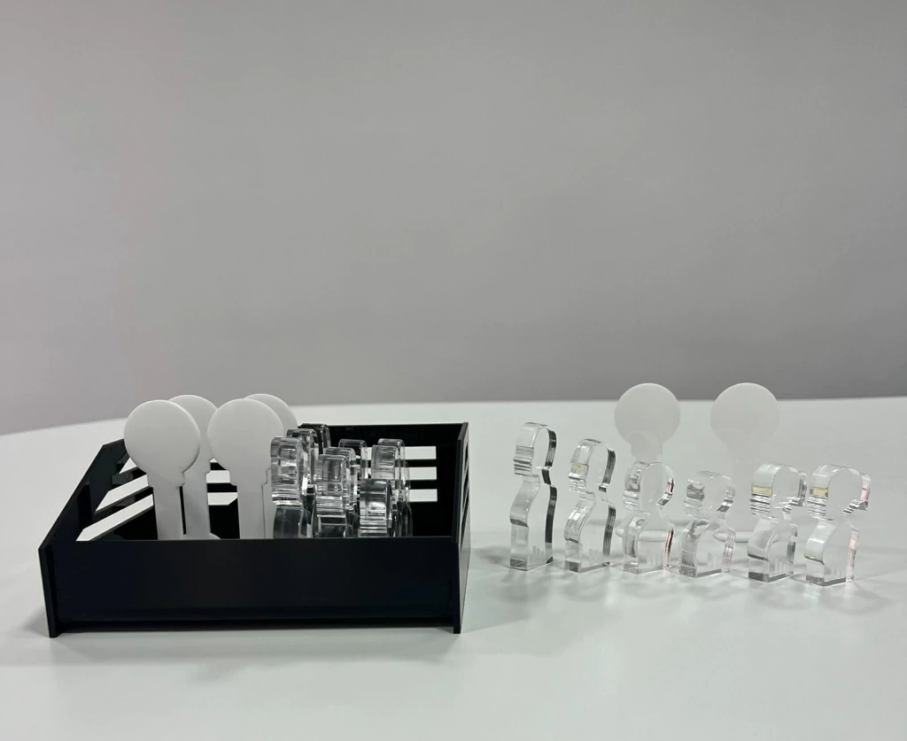 Contém 16 bonecos em silhueta: 5 homens + 5 mulheres + 2 meninos + 2 meninas + 2 bebês + 6 placas em acrílico branco + 1 estojo em cristal preto.